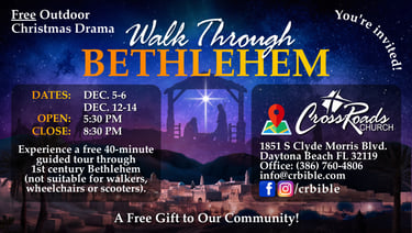 Walk Through Bethlehem will run December 5-6 and 12-14 from 5:30PM-8:30PM at CrossRoads Church (1851 S Clyde Morris) and is a FREE event for the whole family!