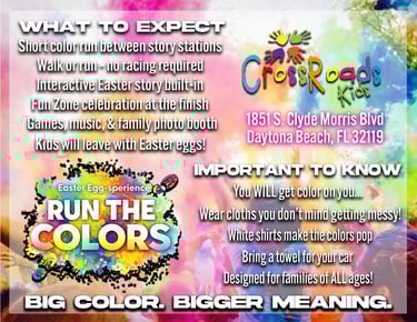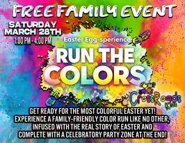 Join us for Run The Colors, a free family event and "Easter Egg-sperience" like no other. This is a family-friendly color run infused with the real story of Easter, complete with a celebratory Party Zone at the end!